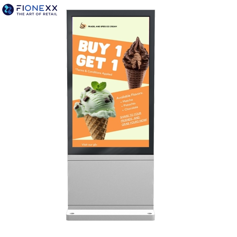 Whether as part of a street-side display or as a unique individual screen, the solution offers a wide range of possible applications. The flexibility of portrait or landscape use and the large display range make them the perfect accompaniment to our outdoor fanless dgital displays.